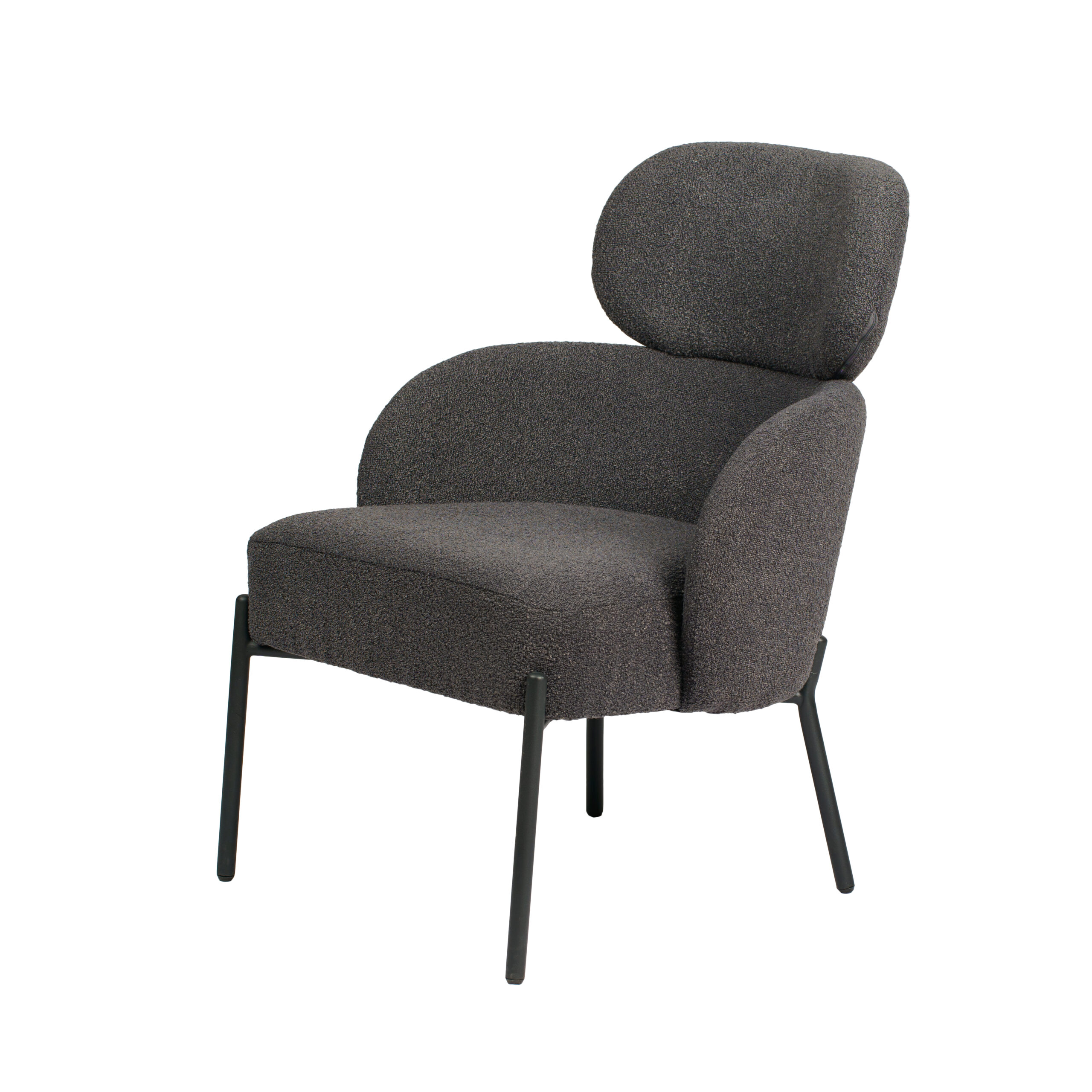 The Jude armchair stands out for its bold, sculptural design. Its distinctive feature is the unique, “floating” headrest and the elegant contrast between the richly upholstered seat and the slender black metal frame. Upholstered in textured, dark fabric, it offers a unique comfort experience and serves as a statement design piece for any modern residential or professional space.