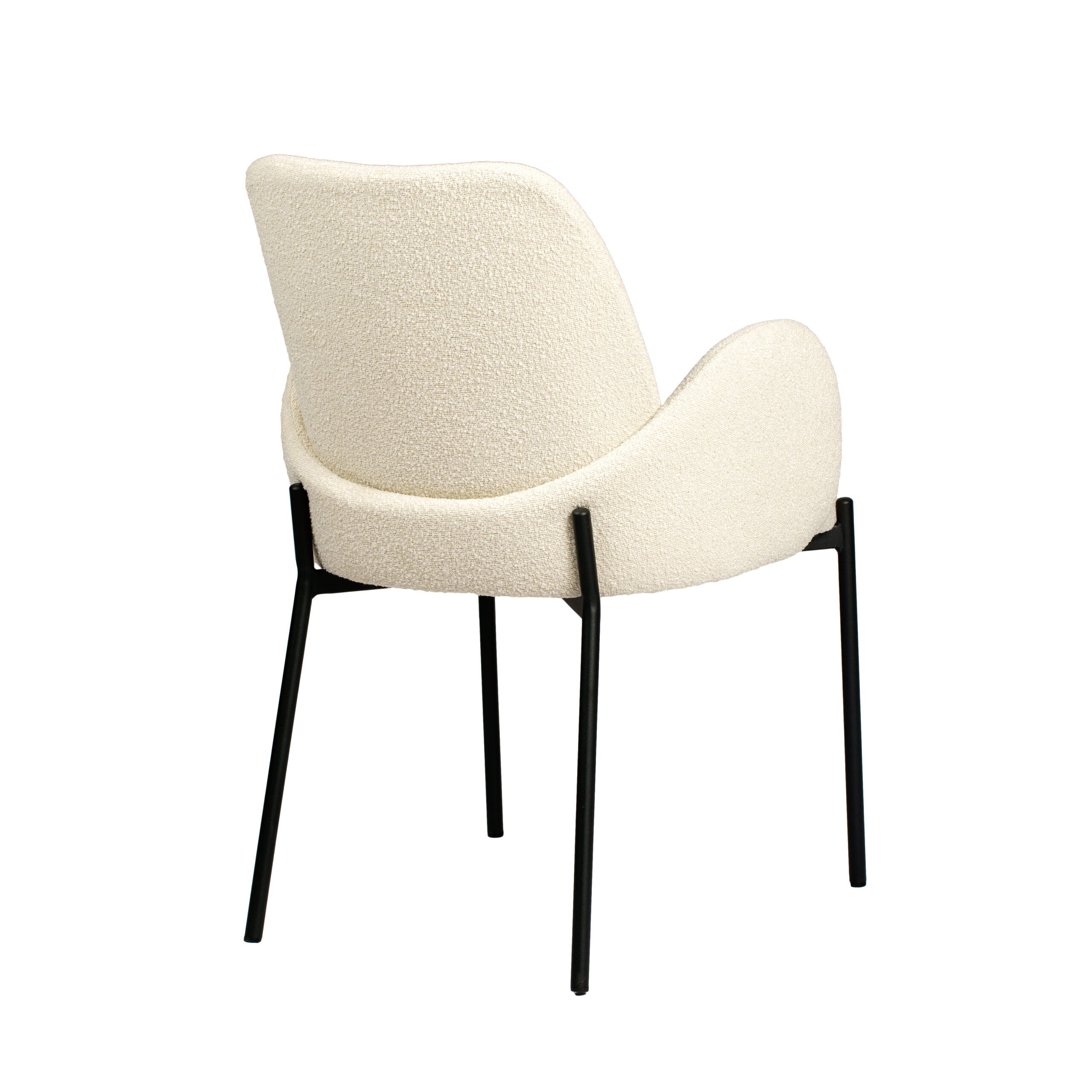 Όλη αυτή η αφράτη δομή στηρίζεται σε έναν λεπτό, μαύρο μεταλλικό σκελετό, ο οποίος προσφέρει στιβαρή στήριξη και δημιουργεί μια έντονη οπτική αντίθεση που τονίζει την πλούσια υφή της ταπετσαρίας. Η επένδυση από ύφασμα άριστης ποιότητας τύπου bouclé προσφέρει μια αξεπέραστη αίσθηση ζεστασιάς και απαλότητας, ενώ το «άνετο κάθισμα» και η εργονομική πλάτη σας προσκαλούν να χαλαρώσετε πραγματικά.