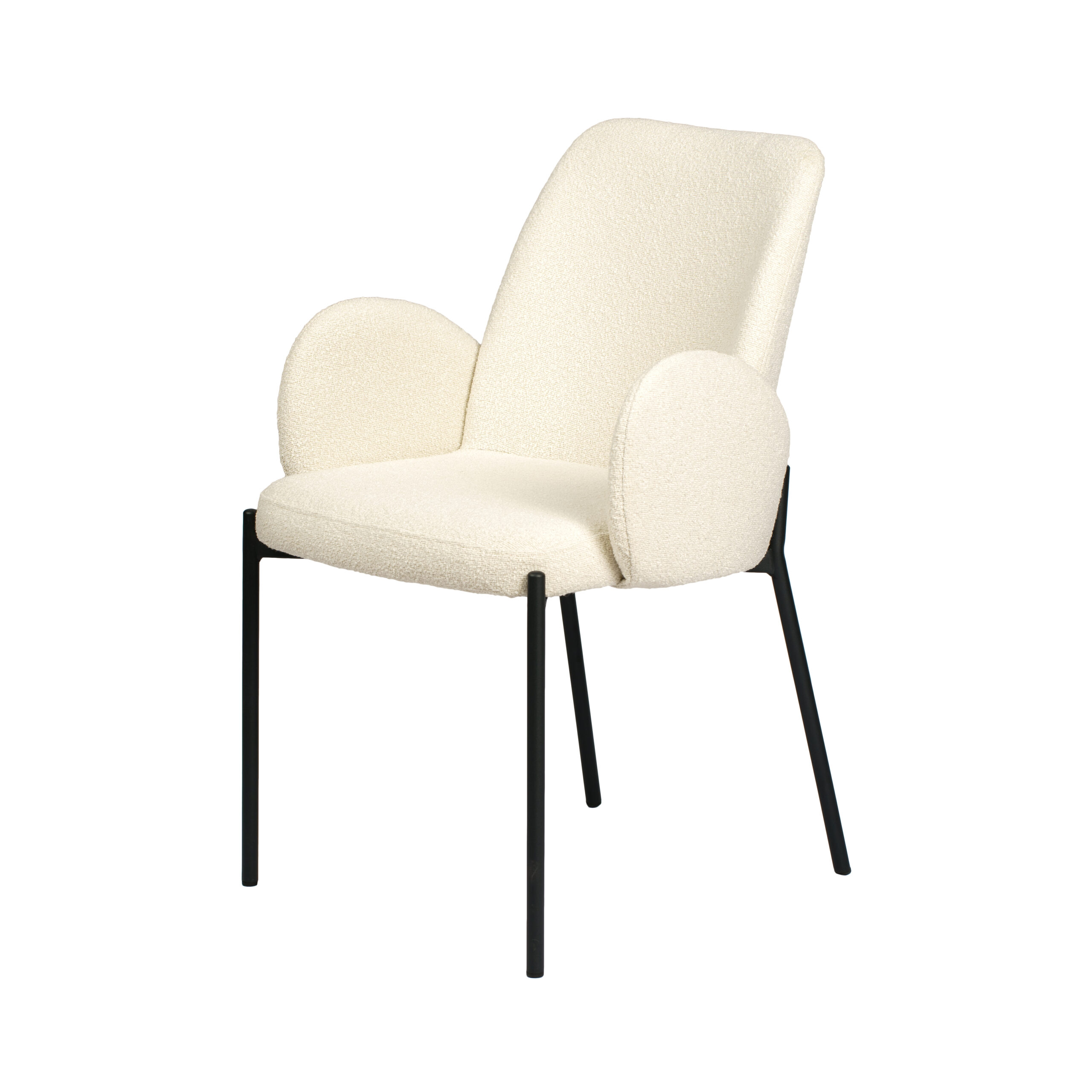 Μια σύγχρονη καρεκλοπολυθρόνα με παιχνιδιάρικο και ιδιαίτερο design. Το πλούσιο, αφράτο σώμα της, επενδεδυμένο με ύφασμα bouclé άριστης ποιότητας, διαθέτει μοναδικά, «αιωρούμενα» μπράτσα. Στηρίζεται σε έναν λεπτό, μίνιμαλ μεταλλικό σκελετό, δημιουργώντας μια εντυπωσιακή αντίθεση ανάμεσα στον όγκο και την ελαφρότητα. Προσφέρει ένα εξαιρετικά άνετο κάθισμα και αποτελεί μια statement επιλογή για κάθε μοντέρνο χώρο.