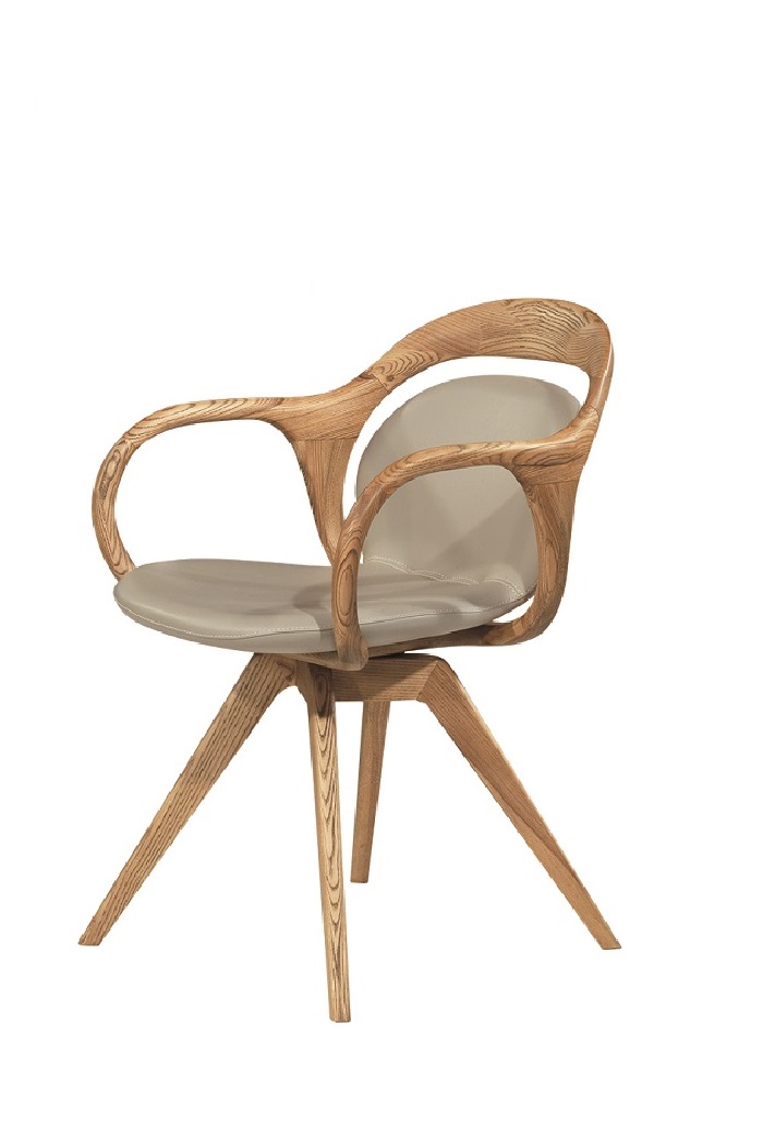 Ο «ιδιαίτερος σχεδιασμός» της είναι μια ωδή στην οργανική ομορφιά του ξύλου. Ο μασίφ ξύλινος σκελετός της μοιάζει να ρέει αβίαστα, με τα μπράτσα, την πλάτη και τα στηρίγματα να σχηματίζουν μια ενιαία, αδιάσπαστη καμπύλη που αγκαλιάζει το σώμα. Κάθε γωνία αποκαλύπτει τα πλούσια «νερά» του ξύλου, μετατρέποντας το ίδιο το υλικό στο κυρίαρχο διακοσμητικό στοιχείο. Η δυναμική βάση με τα ανοιγόμενα πόδια προσδίδει άψογη σταθερότητα και ολοκληρώνει αυτό το γλυπτικό σύνολο.